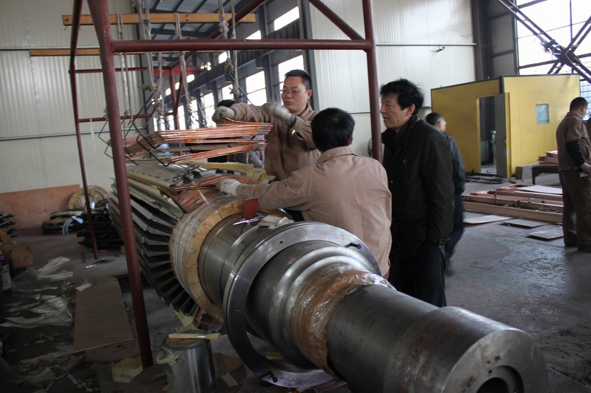 QF-60-2P是公司首次生產的最大容量的汽輪發電機,公司總工程師王寅華到車間現場指導生產